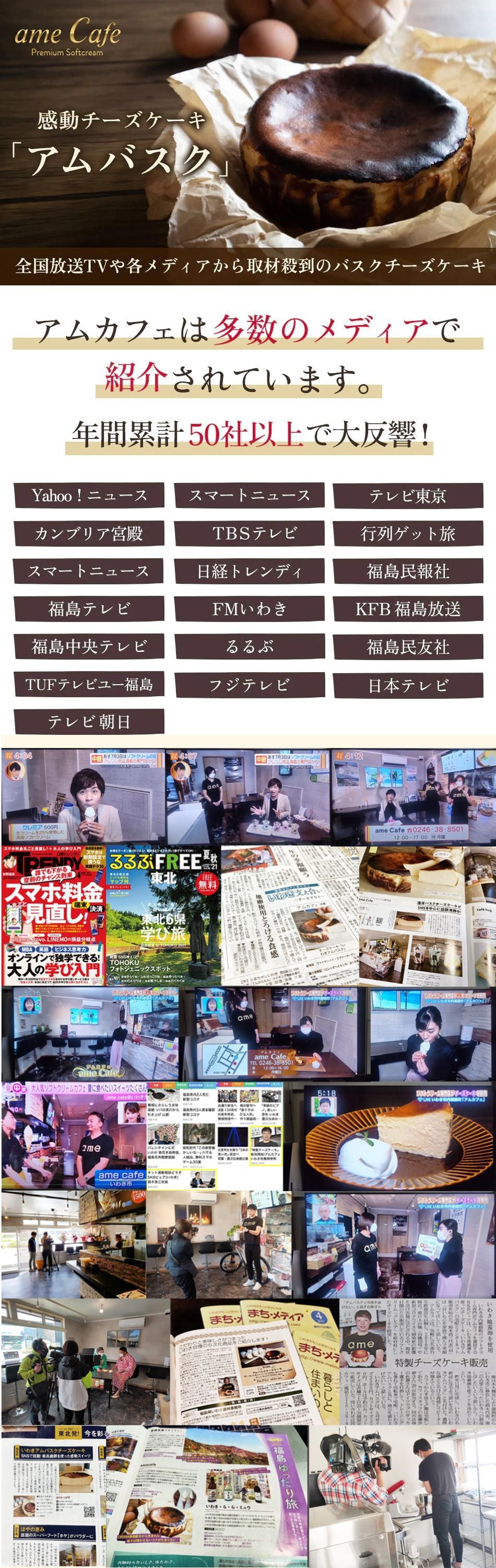 いわき市ふるさと納税返礼品にもなっている、福島県にある ソフトクリームスイーツ専門店 ame Cafe (アムカフェ)にて 製造しています。「アムバスク」 はソフトクリームを独自配合し、毎日産みたてのいわき地養卵を使用しています。 濃厚で口溶けがよく、 とろーりなめらかな口当たり。 高温でじっくり焼きあげた 香ばしい焦げ目が特長。あらゆるビジネスシーンにご利用下さい。